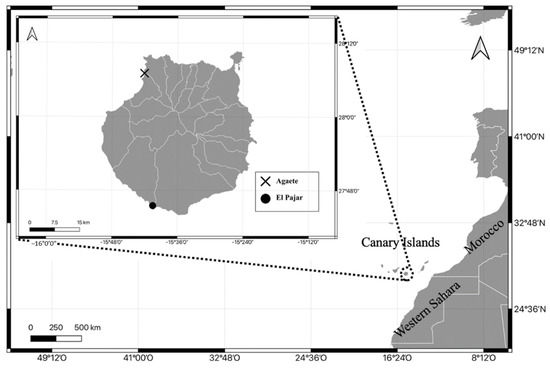 First, 60 rowing crab (Cronius ruber) specimens were collected in two locations in Gran Canaria (El Pajar and Agaete) in 2019 (Figure 1). The sex, the different biometric measurements, and the metal content were determined in the crabs from both locations. Here, 60 samples were captured, of which both the muscle and exoskeleton were used, 30 samples in El Pajar and 30 samples in Agaete, of which 15 samples were from female specimens and 15 samples from male specimens.