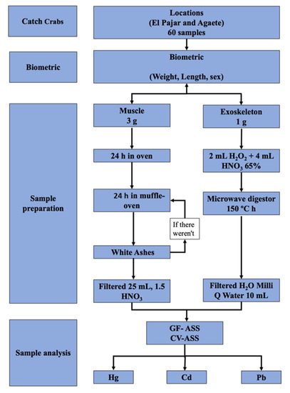 Step 1: The crabs were separated. Step 2: Biometric measurement of the sex, weight, and length was carried out. Step 3: Muscle tissue and exoskeleton tissue were separated. Step 3: The muscle tissue (3 g) samples were placed in the oven for 24 h at a temperature of 80 °C. They were then put in the muffle oven for 24–48 h at a temperature of 450 °C ± 25 °C, until white ashes were obtained. If these were grayish, they were put back in the oven for 24 h after adding pure nitric acid to each one. Subsequently, each of the samples was filtered with a 1.5% nitric acid (HNO3) solution and made up to 25 mL with the same solution (Lozano-Bilbao et al., 2020b). Step 4: Exoskeleton samples (1 g) were processed by means of a microwave digester. To do this, one gram of exoskeleton from each of the samples was used and 2 mL of hydrogen peroxide (H2O2) and 4 mL of nitric acid (HNO3) were added. After the microwave digester program finished, the samples were passed through 10 mL volumetric flasks and made up to the mark with distilled water until the indicated amount was reached. Step 5: The metal content of the processed Cronius ruber samples was determined by using atomic absorption spectrometry with electrothermal vaporization (GF-AAS) with a graphite chamber, and cold-vapor atomic absorption spectrophotometry (CV-AAS) with a flow injection system (FIAS) (Figure 2) [37,38]. A quality control solution was used to assess the determination accuracy every 10 samples. The precision of the analytical procedure was evaluated by analyzing international reference standard materials DORM-1 and TORT-1 (National Research Council of Canada). All data were presented as milligrams per kilogram and wet weight (mg/kg w.w.). Blanks and standard reference materials were run together with samples.
