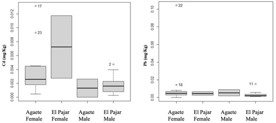 The concentrations of the metals in Table 2 show that the Cd concentration in the muscle is higher in the samples collected in the El Pajar area, with a mean average level of 0.008 ± 0.006 mg/kg in the females. Regarding the exoskeleton samples, there is no variation in the concentrations between males and females from the two study areas. On the other hand, the Pb levels in the muscle tissue are higher in the female specimens from Agaete than the female and male specimens from El Pajar and the males from the same study area. The level of Pb in the exoskeleton is high and is higher than the other concentrations obtained (0.853 ± 1.391 mg/kg) in the Agaete females. Finally, the Hg concentrations are higher in the exoskeleton in Agaete in both sexes than in El Pajar.