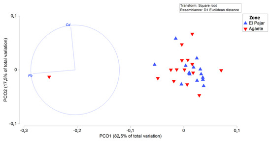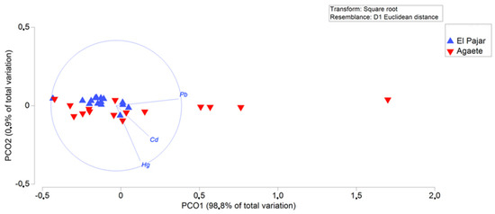 The PERMANOVA in Table 5 shows that there are significant differences in Cd and Pb in the two locations. This suggests that there could be marine pollution from the metals studied here in both locations, derived from uncontrolled discharges from industry, urban areas, or agriculture. However, in the case of this type of pollution affecting Cronius ruber, although the concentrations of some metals are high, they are not worrying. These concentrations are shown in Table 1, with the mean average concentrations according to location and type of sample. El Pajar concentrations of Cd in muscle tissue and the exoskeleton are 0.003 ± 0.002 mg/kg and 0.001 ± 0.001 mg/kg, respectively, compared to concentrations in Agaete of 0.003 ± 0.003 mg/kg in muscle and 0.004 ± 0.004 mg/kg in the exoskeleton. On the other hand, in the case of Pb, the levels are 0.004 ± 0.003 mg/kg in muscle and 0.199 ± 0.096 mg/kg in the exoskeleton in El Pajar, and 0.012 ± 0.025 mg/kg in the muscle tissue and 0.766 ± 1.308 mg/kg in the exoskeleton in Agaete (Table 1), and these differences are confirmed by the PCoA that represents the type of sample and the location. The X-axis of this graph represents 99.5% of the total variation and the Y-axis represents 0.5% of the total variation (Figure 7).