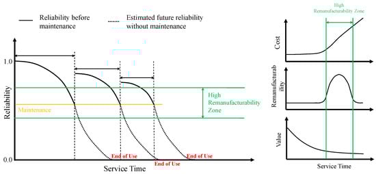 For remanufacturing, there is an ideal high remanufacturability zone that has the optimal remanufacturability and its cost []. The remanufacturability is a criterion for the component of future remanufacturing [,]. It considers the following factors: the quality of the component before remanufacturing, the importance of the component, the technology used for remanufacturing, and the customer awareness of component remanufacturing. These factors were considered in the proposed method to thoroughly assess the remanufacturability of the component. For a new component, reliability is an important factor for assessing degradation and indicating quality.