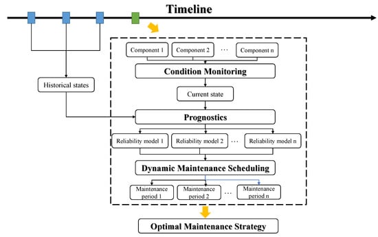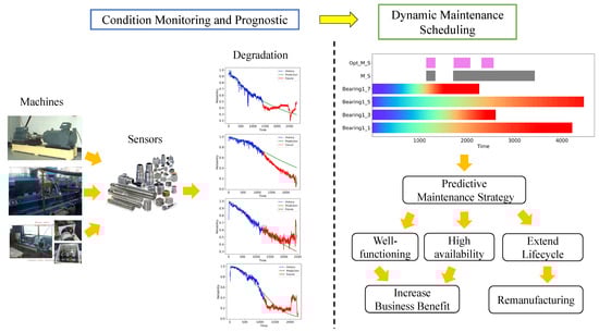Dynamic maintenance scheduling (DMS) provides the company with the optimized period to conduct maintenance strategies, which could implement dynamic searching for the optimal maintenance duration with the help of prognostic approaches []. This will provide the stakeholder more of a chance to benefit by increasing the availability of the machine while it continues to well-function. Meanwhile, the machine and its key component could be replaced at the optimal time to be remanufactured so that its life cycle is extended. The overall workflow of the proposed framework is shown in Figure 3, which obviously displays the relationship between the DMS, CM, and RUL module. The experts could make comprehensive decisions following the optimal maintenance period so that the company will obtain more business benefits.
