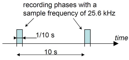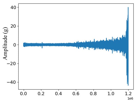 Figure 5 shows the vibration signal gathered during the overall run-to-failure experiment. The testbed was shut down when the amplitude of the vibration reached 20 g, which is the general ending criterion for all the bearing experiments. It is worth noting that the vibration signal is not continuously sampled during the experiment period. As shown in Figure 6, a vibration sample is collected after each specific time interval. The length of the sample is 2560 points, and the time interval is 10 s in each experiment.
