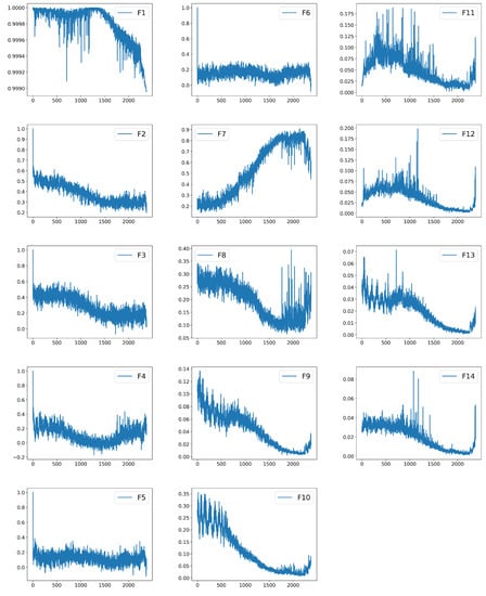As the first step of our proposed method, the original vibration signal needed to be translated to more reasonable features based on the feature extraction method in Table 1. The extracted features are shown in Figure 7. F1–F6 are the RS features, and F7–F14 are the time-frequency domain features. It is obvious that most of the features are monotonous as time goes on, which means they either decrease or increase.