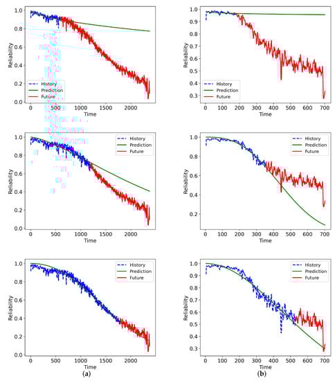 Following the proposed framework, the analysis of the prognostic approach should be conducted once the degradation performance has been evaluated. As shown in Figure 9, the green line represents the learned reliability function, the blue line is the historical states, and the red line is the actual future state. It is obvious that the green line is close to the red line with the increase of the historical data (, , and ). This means that the accuracy of the reliability increases as time progresses