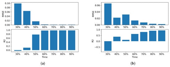 As shown in Figure 10, the RMSE is very large and the R2 is close to zero when the machine starts working after a while. In this period, the machine is operating under normal conditions, and the reliability should be close to 1. As degradation continues, the RMSE will decrease to zero, and the R2 will increase to 1. The results show that the reliability function will be highly accurate after accumulating a certain period of historical data. Based on the analysis of the results, it is obvious that the reliability function is dynamically changing where model parameters will be quickly updated once new data becomes available.