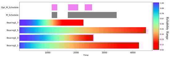 The maintenance schedule is the outcome of the proposed predictive maintenance framework. Each bearing has its own reliability function, the manager could decide the maintenance time period based on the separate reliability functions. We assume that there are four bearings on a machine, then we could obtain all overall reliability as shown in Figure 11. Considering the suitable cost of remanufacturing, the threshold period of reliability is set to . Then the separate maintenance period can be calculated as shown in Table 4. Based on the separate maintenance period, we could obtain the optimized period which could reduce the planned downtime frequency from four times to three times. Compared with the optimized results, the second strategy is better because the could work more time.