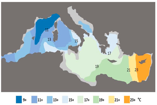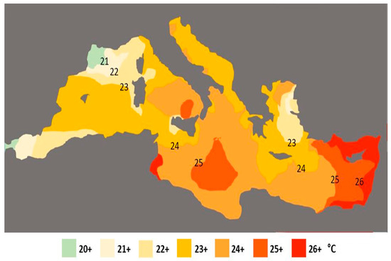 Summer surface temperature (°C) of the Mediterranean Sea during the last glacial maximum (LGM). Maps modified from Hayes et al. [16]. The light gray coasts are the emerged lands.