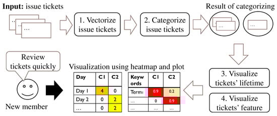 Herein we propose a novel method to categorize tickets and visualize characteristics of each category. Figure 1 overviews our method. Our method requires only managing tickets in an ITS. First, tickets are converted into vector representations to apply a clustering method. Second, the clustering method automatically categorizes the tickets and estimates the appropriate number of ticket clusters. Finally, our method visualizes the lifetime and features of the ticket categories. Our ticket feature visualization has two main aspects. First, it counts the time series change of ticket categories and displays the results as a heatmap. This helps new members quickly review tickets and identify features that they should work on first. Second, our ticket feature visualization identifies the relationships among ticket categories and keywords. The results are displayed by heatmapping and PCA. Our ticket feature visualization helps new members determine which categories are related to the features.