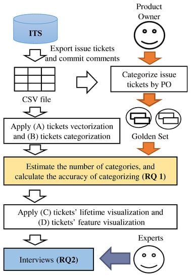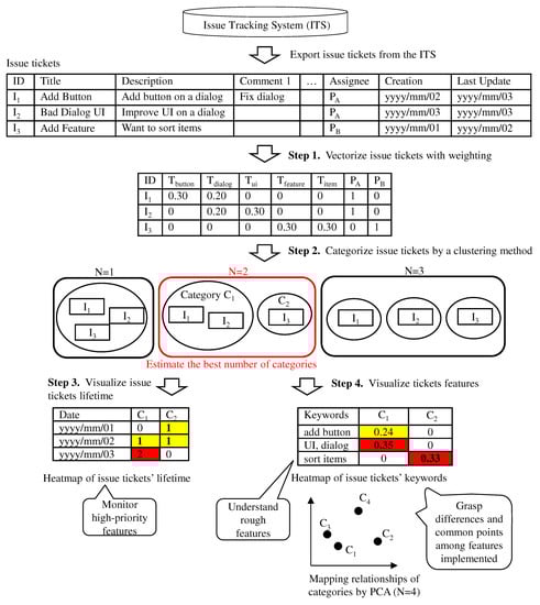 - Ishizuka, R.; Washizaki, H.; Fukazawa, Y.; Saito, S.; Ouji, S. Categorizing and Visualizing Issue Tickets to Better Understand the Features Implemented in Existing Software Systems. In Proceedings of the 10th International Workshop on Empirical Software Engineering in Practice, IWESEP 2019, Tokyo, Japan, 13–14 December 2019; pp. 25–30. [Google Scholar]