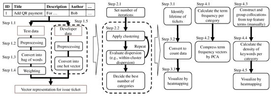 - Step 1.2. To enhance the accuracy of ticket categorization, parse the extracted text data into terms and filter uninformative terms such as stop words. If terms are not separated by white space, use morphological analysis to parse the sentence into terms (e.g., [37]). For example, if only nouns are extracted from ticket , “Button” from the title, “button” and “dialog” from the description, and “dialog” from comment 1 are extracted (Figure 2).