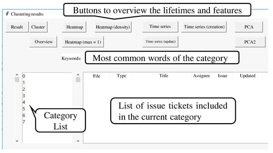 In ticket lifetime visualization, we converted the creation and update dates on a weekly basis to easily estimate which categories to focus on. In Step 4.3, we made 51 collocations and organized them into 21 groups using nine top clustering terms of every ticket category by hand. During the interviews, we implemented a GUI for developers. The GUI showed a list of tickets and the top clustering terms by category (Figure 7). Moreover, we checked the ticket lifetimes and features by pushing buttons on the GUI.