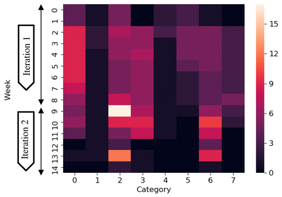 Our visualization is expected to help developers quickly review tickets and determine which ones to read first. For example, many tickets were created in category 2 and category 6 beginning in week 9 (i.e., iteration 2) and week 13 (end of development) (Figure 8). Moreover, most of these tickets were closed within a week. We assumed that some features related to these categories were added or modified rapidly in the later development. Consequently, these tickets should be checked first. On the other hand, in category 1, many tickets were created at the early development stage, but were closed as the development progressed. As this suggests that the features related to category 1 are stable, such tickets do not need to be read immediately. Our visualization is expected to help developers understand the software system features of a project, even if our categorization method is not completely accurate. Developers can predict what other features are affected when one feature of the software is modified. In Figure 9 and Figure 10, for example, categories 2 and 3 have similar principal components and keywords. Thus, developers can predict that the features of category 2 and those of category 3 are linked. Moreover, developers can envision which features are implemented at a certain period.