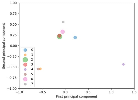 - Step 4.2. To simply visualize the relationships among categories, compress every term frequency vector into a two-dimensional vector by PCA and plot the results in two-dimensional space. For example, four categories are mapped in Figure 2. Categories and have similar features. Then our method creates a heatmap, which indicates the kind of terms appearing in each ticket category using the following steps:
