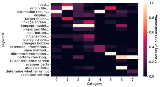 - Step 4.3. To make lists of keywords, select the top clustering terms from each ticket category and manually construct collocations from the extracted terms. It should be noted that terms are not limited to nouns but can include all terms. Then group the collocations and terms. For example, two keywords, “add button” and “sort items”, are constructed, and keyword “UI” and “dialog” are classified into the same group (Figure 2).
