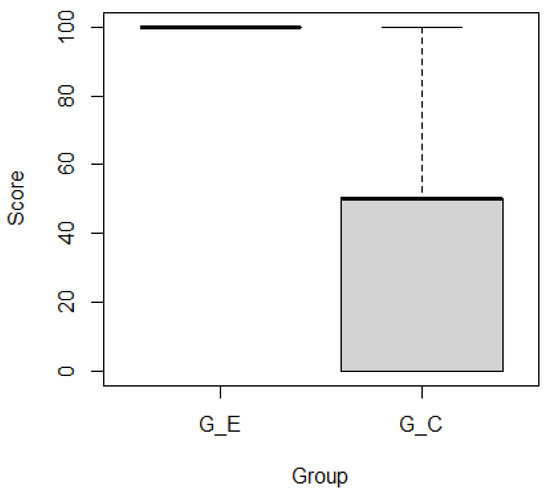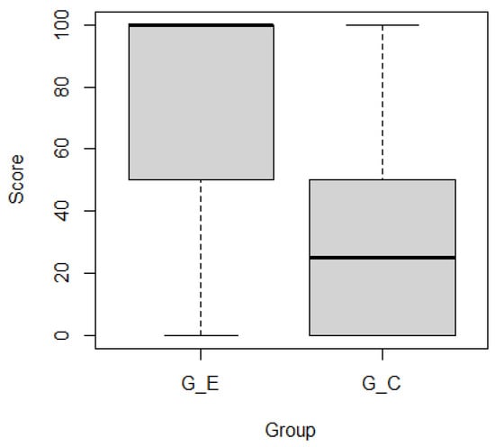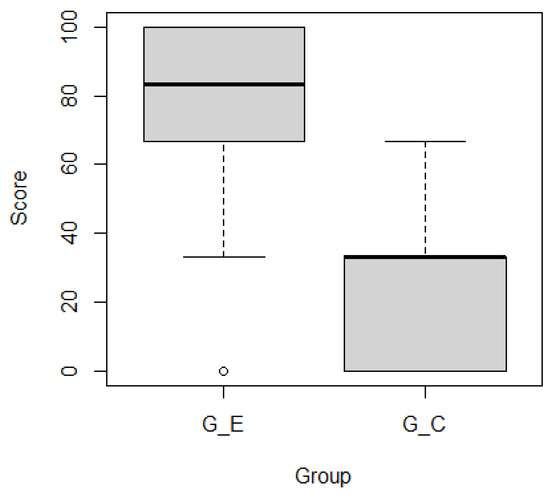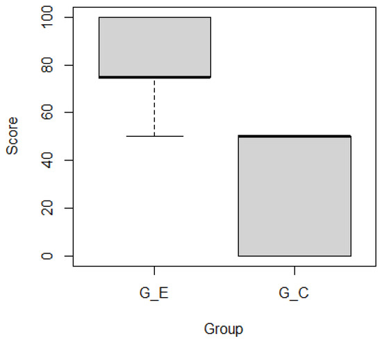 Figure 11 and Figure 12 show boxplots of the subjects’ scores by group for ticket activeness comprehension tasks and , respectively. Subjects in outperformed those in . Mann–Whitney’s U test confirmed that there were significant differences in the representative values of the two groups for ( ***) and ( **) as the significance levels were 0.001 and 0.01, respectively. Figure 13 and Figure 14 show boxplots of subjects’ scores for both groups for feature activeness comprehension tasks and , respectively. outperformed . Mann–Whitney’s U test confirmed that there were significant differences in the representative values between the two groups for ( ****) and ( ****) with a significance level of 0.0001.