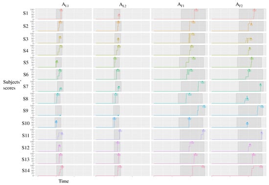 Figure 15 and Figure 16 show the changes in scores over time for and , respectively. Most subjects in began to answer correctly around the middle of each session, and from this point, they rarely changed their answers. For example, subject scored 100 points for three tasks , , and around the middle of each session and scored 50 points for . Thus, our method supported most subjects. By contrast, most subjects in needed more time to obtain correct answers, which resulted in lower scores. For example, subject scored 0 points for three tasks , , and but scored 50 points for near the end of the session, indicating that most subjects struggled to identify the correct answers.