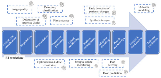 AI has been applied to patient care coordination and optimization to create a data management system for clinical and research processes [9]. The implemented system was trained to extract relevant information by direct connection with structured data and text mining technology, which allowed an objective evaluation of key performance indicators to improve patient care management. ML was also used as a tool for clinical decision support in a multicentric context [10]. In particular, Field et al. [10] developed a platform to coordinate data analysis across RT centers using distributed or federated learning methods after a harmonization phase. Moreover, other examples of complex jobs with custom constraints that AI could optimize include scheduling RT treatment appointments, checking machines, and patient-specific quality assurance (QA).