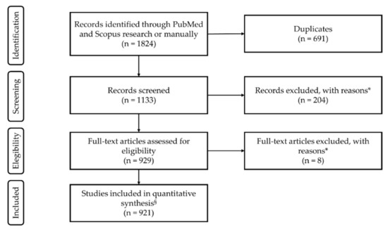 The reported PubMed and Scopus searches identified 1824 papers, selected as described in the PRISMA flow diagram (Figure 2).