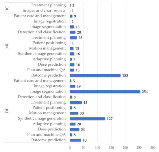 Out of the 921 included papers reporting the types of methods employed (i.e., IO, ML, or DL), 321 papers (34.9%) used ML methods and 596 (64.7%) used DL methods. Four papers (0.4%) investigated the application of IO approaches to image and chart reviews and the Pinnacle treatment planning system. In particular, the Pinnacle auto-planning module is based on the ability of a digital computer to perform tasks commonly associated with human intelligence through a system of iterative optimization [8].