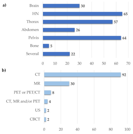 Several commercial, open-source research tools are now available for auto-segmentation [32,33,34,35,36,39,40,41,47,66,67,68,69]. Among the investigated papers, 138 used a convolutional neural network (CNN) specifically designed for image recognition and computer vision applications. These techniques were applied in the RT field to segment lesions or OARs in several areas and image modalities. Excluding CT alone, the second most frequent imaging modality is MR, thanks to its ability to provide superior soft-tissue contrast and PET/CT images to obtain metabolic information (Figure 5b).