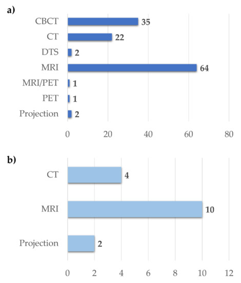 Another application of AI methods involves the generation of synthetic images with increased quality, performed mainly on CBCT images (in 11/21 papers). Finally, Dai et al. [39] generated synthetic MR images to improve the auto-segmentation accuracy.