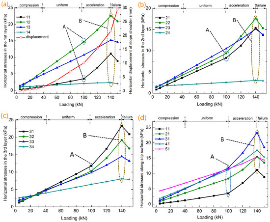 - The development process of major cracks is inherently consistent with the variation processes of horizontal stresses near the major cracks and slope shoulder displacements. In addition, the limit loads of horizontal stresses and displacements are consistent. When no cracks appear, the displacements increase slowly or uniformly, while the horizontal stresses increase uniformly. When a trailing edge crack occurs, the development of horizontal stresses and slope shoulder displacements begin to accelerate in general. The occurrence of the front edge crack causes the horizontal stresses of the nearby measuring points to appear as inflection points. At the same time, the slope shoulder displacements develop rapidly.