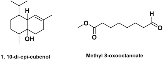 The Spatial Data File (SDF) of 1,10-di-epi-cubenol (CID: 12046149; Figure 2) and methyl 8-oxooctanoate (CID: 535040; Figure 2) were obtained from PubChem. The SDF file was converted to the Protein Data Bank, Partial Charge (Q), & Atom Type (T) (PDBQT) format using AutoDock Tools v1.5.6 (Scripps Research, CA, USA). For the final ligand preparation Gasteiger partial charges were added, rotatable bonds were defined and the nonpolar hydrogen atoms were merged.