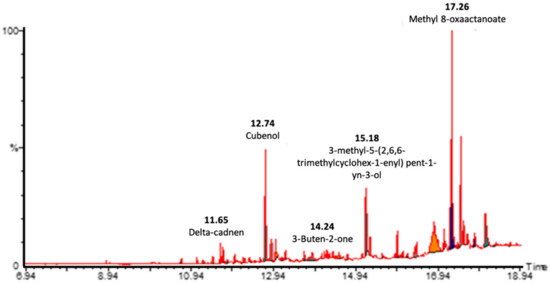 In the investigation of unknown plant components, GC-MS plays a crucial role. Plant materials are often complex, making GC-MS an excellent choice for their examination due to its high sensitivity and selectivity. Compounds are ionized and their mass numbers are measured using GC-MS. This adds to the structure of these profiles by providing more information [35]. A total of 20 compounds were identified in the extract. The findings indicated that there was a presence of 3 methyl 8-oxooctanoate (17.6%) and 1,10-di-epi-cubenol (13.4%) as the major compounds in the chloroform extract of C. bruguieriana.