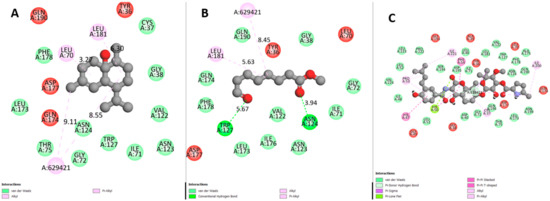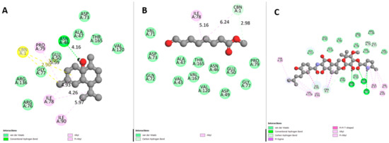 Two-dimensional scheme of DNA gyrase interaction with the tested ligands, (A): 1,10-di-epi-cubenol; (B): Methyl 8-oxooctanoate; (C): Clorobiocin (control). Dotted lines: Distances between ligand atoms and receptor amino acids.