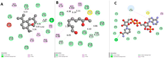 Two-dimensional scheme of DHFR interaction with the tested ligands, (A): 1,10-di-epi-cubenol; (B): Methyl 8-oxooctanoate; (C): SCHEMBL2181345 (control). Dotted lines: Distances between ligand atoms and receptor amino acids.