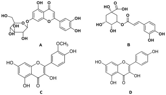 Chemical structure of biomarkers luteolin 7-O-glucoside (A), chlorogenic acid (B), isorhamnetin (C), kaempferol (D).