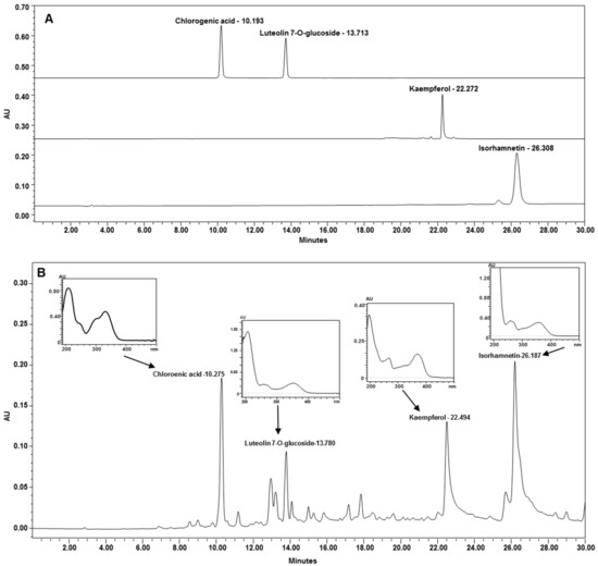 The biomarkers, luteolin 7-O-glucoside, chlorogenic acid, kaempferol and isorhamnetin were purchased from Phytolab (Vestenbergsgreuth, Germany). The analysis was performed by HPLC with UV detection (Alliance 2695 Separations Module, Waters Instruments, Inc., Milford, MA, USA) using a reverse-phase C18 column (Pinnacle C18 column, 250 × 4.6 mm, 5 μm, Shimadzu, Kyoto, Japan). The mobile phase was composed of different proportions of (A) 0.5% acetic acid in ultra-pure water (acidified water), and (B) acetonitrile and methanol (60:40, v/v) using a flow rate of 1 mL/min. The optimized gradient program was as follows: 0–5 min (0–55% B), 5–10 min (55–65% B), 10–20 min (65–90% B), 20–30 min (90–100% B), and 30–35 min (0% B). Samples were injected into the system at 20 µL. The detection was performed at a single wavelength (280 nm) and processed using EMPOWER software, version 2.