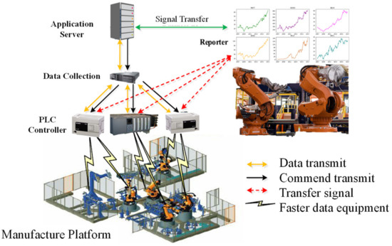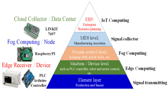 Figure 3. First, the proposed architecture implements data collection, which depends on the PLC using the edge/sensing-computing method. Normally, the PLC arranges one or more sensors and connects them to the hub management center. After receiving the data, fog computing is directly uploaded to the cloud computing system to register the ID, which is added to the whitelist of the connected management center. During the operation of a production line, management is obtained based on the essence of the IoT. According to the concept of IoT, the production line establishes edge computing for basic layer sensor data collection, such as infrared or electromagnetic sensors, and is used to control the production line scheduling signals. The fog-computing controller was applied to the CNN to analyze the signals. Based on IoT cloud system, the signal can be referred to as the basic requirement for the end-user needs [
