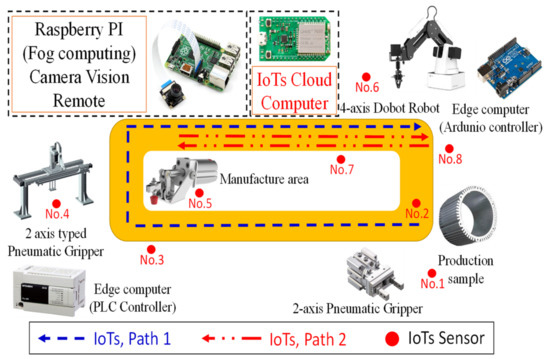 11], a sensing method was proposed to enable the widespread adoption and development of IoT technology in the manufacturing industry to be close to the user. This has played an important role in the manufacturing industry. For example, radio frequency identification (RFID) has been applied to electromagnetic field effects to transmit data for automatic identification and tracking of tags attached to the target product. The RFID system is composed of a tag and a reader. The tag stores the information being read. In other words, tag data can also be obtained through decryption without requiring additional signals to be provided to other systems. Therefore, the RFID reader can indirectly track the physical movement state mode of the tag. Therefore, it can indirectly track the physical movement of the object to which the tag is attached. In industrial manufacturing procedures, RFID can be applied to the management of the supply chain, production scheduling, part/vehicle tracking, etc. The sensors, wireless networks, and sensor networks (wire-less sensor networks, WSNs) can also be configured out of space from a node structure. The node structure is used to sense the surrounding environment, and can then be manipulated and other node communication signals obtained. Sensor nodes operate in a self-organizing and decentralized manner to maintain the best connection status as much as possible. RFID and WSNs represent two complementary technologies. RFID can be used to discover and identify the locations of objects that are difficult to detect or distinguish using traditional sensor technology. However, they cannot monitor the state of the objects. In contrast, wireless sensor networks not only provide information about objects and environmental conditions but also support multi-hop wireless communication. Some WSNs may be equipped with actuators to perform the appropriate actions. Finally, RFID and WSNs could be combined to facilitate industrial development. In this study, we propose many controllers for constructing smart factories, including sensors, RFID, and WSN control methods. However, it is unfortunate that production line process objects are not fully monitored by lens imaging technology with artificial intelligence (AI) algorithms. In addition, the color of the production line with the recognition method has rarely been mentioned.