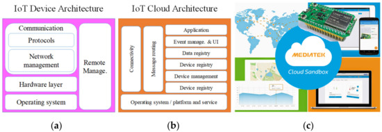 Figure 9. This is a simple diagram of IoT architecture. The foundation of the cloud system is mainly based on IoT chip development by MediaTek. Meanwhile, MediaTek has established a cloud-data service platform, MCS, that can be connected to different IoT devices. This is used in the MCS system to quickly realize IoT prototype. Thus, each test of the prototype device provides multiple definitions of the data channels.