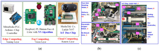 Figure 6 illustrates the physical system used to implement the industrial network. This is the main component of technology. The system embeds the CNN model in a pre-set program. First, the physical sensing layer contains an actual measurement intercept point that is continuously collected. Industrial equipment and systems are required. The software and hardware of the embedded system (MediaTek 7697 and Raspberry PI 4S) were developed externally. Therefore, the communication status between the physical environment and the on-site network environment is determined. Second, the fog layer contains the technical components required to accept the input information of the physical layer, which executes and returns the analysis results. Finally, the cloud layer of back-end users includes maintenance-related factories that need to deploy and receive network information for each atomization layer.
