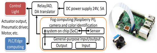 Figure 8. The embedded system of the Raspberry PI is defined as a fog-computing controller, and the general input and output of the node are extended and connected as a relay to control the terminal node to transmit the status of the control light. The output was linked to the PLC. The main purpose was to immediately stop the operation of the production line until no dangerous elimination was expected, at which point the production line could be restarted.
