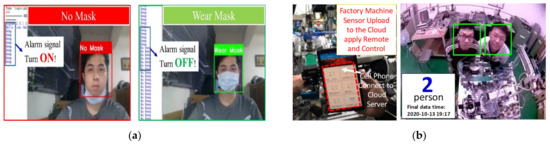 Figure 12 shows the face recognition results constructed by applying the neural theory. The Raspberry PI system is detected by fog computing that outputs the recognition signal, which includes the human wear mask and motion-tracking detection. By synchronously uploading data to the cloud computing controller for calculation and monitoring, the functions of factory population monitoring are achieved. During the visualization process to repair a rejected product, pre-shipment inspection is necessary. The system uses real-time location data and shipment urgency to track progress. It can repair and reduce human costs after required additional delivery procedures. In the future, these challenges will include image analysis of production-line workers and equipment during the test and analysis of the relationship between these data and test log data. To use these results, it is necessary to further reduce the scrap rate of finished products. In addition, it is difficult to reduce indirect costs and extend the visualization plan to the entire supply chain and between other factories. To create a solution using an IoT structure, both design and experiments are proposed to monitor the status of workpieces on a smart factory platform. As shown in