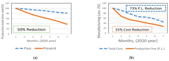 Figure 15 shows the results of these studies. The lead-time for manufacturing was reduced by 50%. In addition, the product can be visualized, and the elimination of defects helps to reduce defective products by 73% in the production of workpieces, which reduces the total cost of factory work, and enables a faster CNN method to improve the production delivery, respectively. These improvements have helped reduce the production area and inventory by at least 50%. This research has some relative benefits: for example, it can reduce the material storage space of upstream manufacturers. It can also use the excess space in the factory for service, business, and production line research and development.