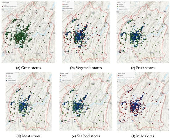 Various types of point-of-sale POI (point of interest) data were crawled in Baidu Map service, including data for 173 large supermarkets, 680 vegetable points of sale, 614 fresh aquatic product points of sale, 552 milk and dairy product points of sale, 623 meat points of sale, 5973 grain and oil points of sale, and 1249 fruit points of sale. These stores included supermarkets and markets (food market and farmers’ markets). Figure 2 shows their spatial distribution in Chongqing.
