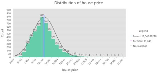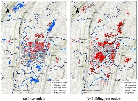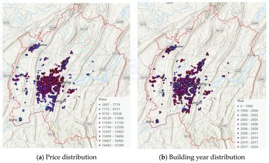 Data for house prices were mainly obtained from Anjuke (anjuke.com) and 58.com (last accessed date: 2021-11-26). A total of 5213 community points and their average house prices were collected for the main urban area. The house prices in the main urban area of Chongqing ranged between 2897 and 37,290 RMB, with an average house price of 12,046 RMB. The main distribution of house prices ranged between 5000 and 20,000 RMB. Figure 3 shows the numbers of households in different communities. The results of local Moran’s analysis are shown in Figure 4. Fields of “HousePrice”,” BuildingYear” refer to Price and Building Year of communities separately. An analysis of the construction time of the communities showed a trend of continuous expansion to the city boundary. Figure 5 shows the distribution of community households, whereas Figure 6 shows price statistics information.