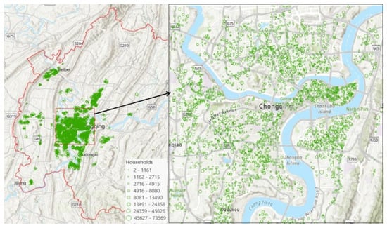 The development of the economy and the unique terrain of Chongqing are also important considerations for analyzing food accessibility. The early development of Chongqing involved the introduction of numerous industries. This development of Chongqing played an important role in the larger-scale development of China to set the foundation for a comprehensive national industrial base dominated by heavy industry, involving the machinery, chemical, metallurgical, food, and textile industries []. The duality of the overall development of Chongqing is reflected in: (1) the large proportion of traditional agriculture and its lagging development; (2) the large gap between income and consumption levels; (3) the large gap in labor productivity between industry and agriculture; and (4) numerous migrant workers in the city.