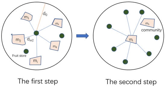Step 1: Given a food store POI location of type k as j, the model searches for any community i within the time cost distance threshold d0 to form a region Fj centered on j. The time cost value dij between community mi and store Sj is calculated by the Gaussian function G for weighting; the contribution of Cj is accumulated for all communities i in the region Fj; and finally, the ratio Rj between the population served (Sevj) in store j and Cj is calculated.