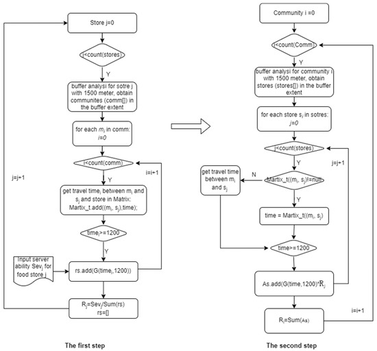 Ai is a value that lies between 0 and 1. An Ai = 0 indicates that the community i is not reachable within a 20 min walk. The reachability of the community increases with increasing values of Ai. The algorithms were written to implement an enhanced two-step approach to calculating the accessibility index in combination with the Rest service (http://api.map.baidu.com/route=matrix/v2/walking?output=json). The accessibility indices were obtained under the same conditions by automatically obtaining the accessibility values of various types of food from 12:00 p.m. to 5:00 a.m. at night. Figure 8 shows the flow diagram of the algorithm. In this method, the first step uses the 1500 m range to filter out communities within 20 min for each store and then calculate the community’s contribution (r) to the store. The second step uses the 1500 m range to filter the stores that can be reached within 20 min for each community and then calculates the comprehensive accessibility (Ai) by the r value for each community.