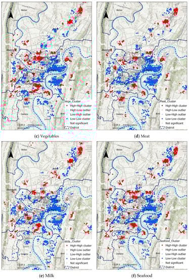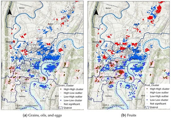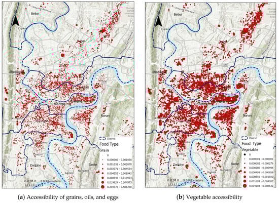 The distribution of food and oil categories was generally even, with no obvious land aggregation evident (Figure 11), and there was good access to food and oil in the city. There were similar aggregations in accessibility for vegetables, fruits, meat, seafood, and milk. Food accessibility in each district gathered in roughly the same places, showing a strong correlation with the distribution of supermarkets and markets in the city. This result also reflected the high ability of the market to regulate food accessibility. Since the location of the market is controlled by the government, it also reflects the government’s ability to control the accessibility of main foods, thereby facilitating the equitable management of the city.