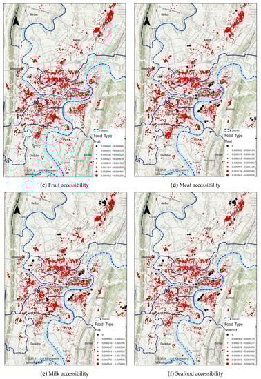 The present study calculated the accessibility values of different foods based on the enhanced two-step algorithm. Figure 9 shows the spatial distributions of accessibility of different types of food, with the point size in the figure representing the accessibility capability. Among the nine main urban areas in Chongqing, areas with high food accessibility were generally distributed in the center of each district. In Figure 9, the black dots represent the districts that were not accessible within a 20 min walk (AI = 0). The results showed no areas in the city that were inaccessible for grains, oils, eggs, vegetables, or fruits, whereas there were a few areas along the borders of each district or in newly developed areas that were inaccessible for seafood, meat, and milk. This result could mainly be attributed to many of the newly developed neighborhoods having incomplete facilities. In addition, there was a relative lag in access for some foods within a 20 min walk. Moreover, rural areas are often found at the periphery of urban areas; households in these rural areas raise some poultry, which was not considered in the present study.