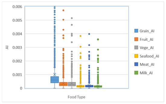The AI values of various food categories were categorized and plotted as box-and-whisker plots (Figure 10). When combining all types of accessibility indicators, the accessibility of grain and oil exceeded those of several other food categories, reflecting the high accessibility of staple foods in Chongqing. The food category of fruits and vegetables had the second-highest accessibility, whereas the accessibility values of seafood, meat, and eggs were relatively small. These results are consistent with the larger situation in China of more affordable fruits and vegetables and lower demand for meat. Figure 10 was not used to filter the outlets.