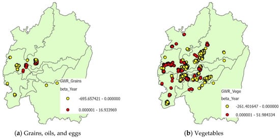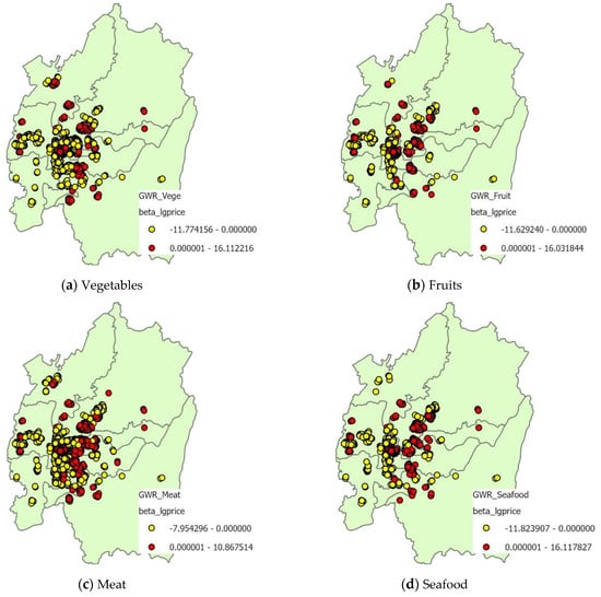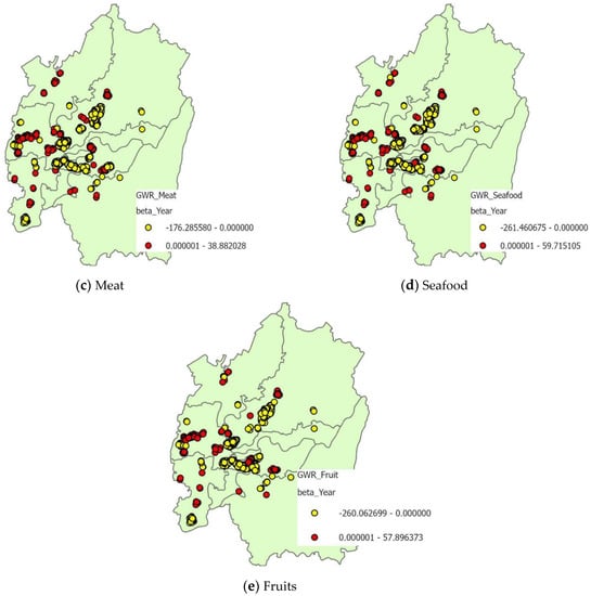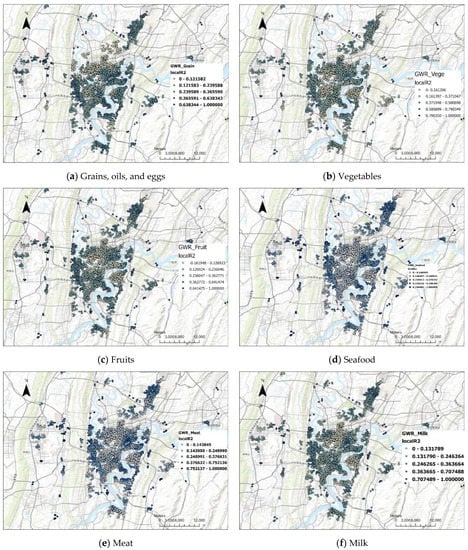 Using food accessibility withing a 20 min walk as a spatial range, the present study used a geographically weighted regression of the valid variables retained by OLS using a broadband of 1200 m. Table 3 shows the GWR model fits (R2 values) for various food items. The results indicated that vegetables, fruits, seafood, meat, and milk show significant aggregation in different areas. Since walking 1200 m takes approximately 20 min, the choice of 1200 m as the bandwidth of GWR was beneficial to local regression.