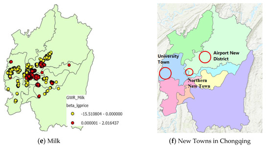 As shown in Figure 12a–e, the accessibility values of vegetables, fruits, seafood, meat, and milk increased with increasing house prices in some old urban areas. Furthermore, lower food accessibility corresponded with increased housing prices in some new development areas far from the center of the city (University Town, Airport New District and Northern New Town, etc.). On the one hand, newly developed areas contain a higher number of new houses. These new houses have been more expensive than older houses since 2018 because of the restrictions of Chinese real estate policy and a higher demand for new houses. On the other hand, vegetable street markets exist in suburban areas, and some residents of these areas grow their own vegetables, thereby further enhancing food accessibility. This is related to the more mature food supply chain of the old city; that of the new city is expected to gradually develop.